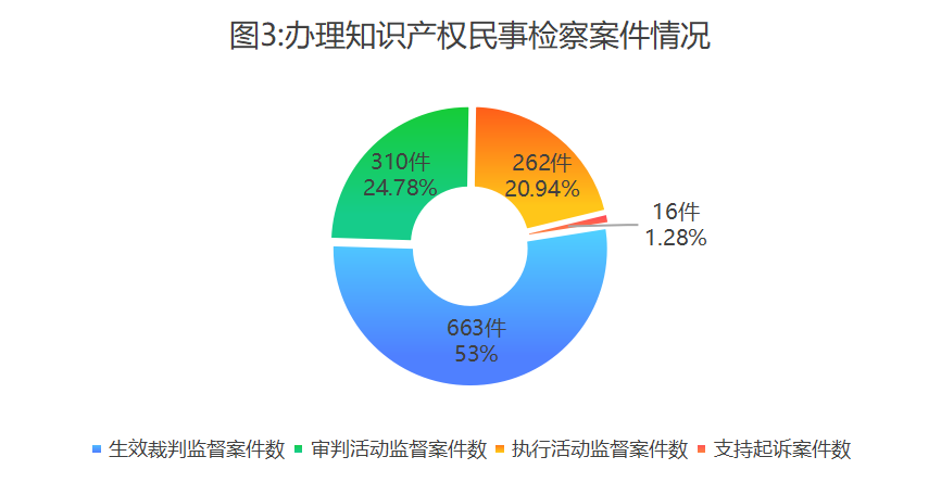 各级检察机关办理知识产权民事检察案件1251件。其中,民事生效裁判监督案件663件,民事审判活动监督案件310件,民事执行活动监督案件262件,民事支持起诉案件16件。