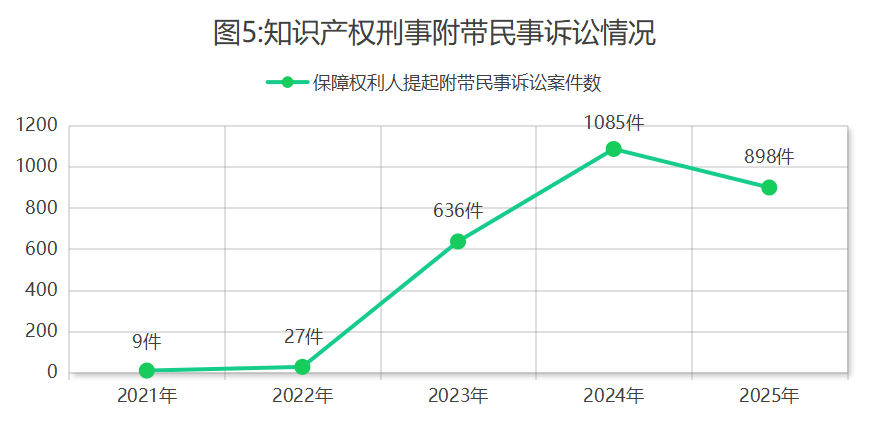 4.推进知识产权刑事附带民事诉讼。起诉的侵犯知识产权犯罪案件中,保障权利人提起附带民事诉讼898件,占比9.8%,有效降低维权成本,减轻权利人诉累。