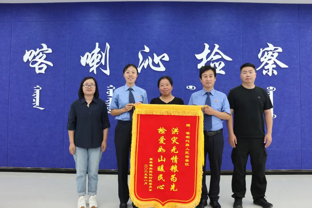 如今,洪水已退,村庄逐渐恢复了往日的生机与活力。为表达对喀喇沁旗人民检察院帮助和支持的感谢之情,头把火村送来了这面锦旗,“洪灾无情粮为先,检爱如山暖民心”几个大字熠熠生辉,既是对检察工作的认可和赞扬,同时也是检察人员同头把火群众之间深厚情谊的见证。