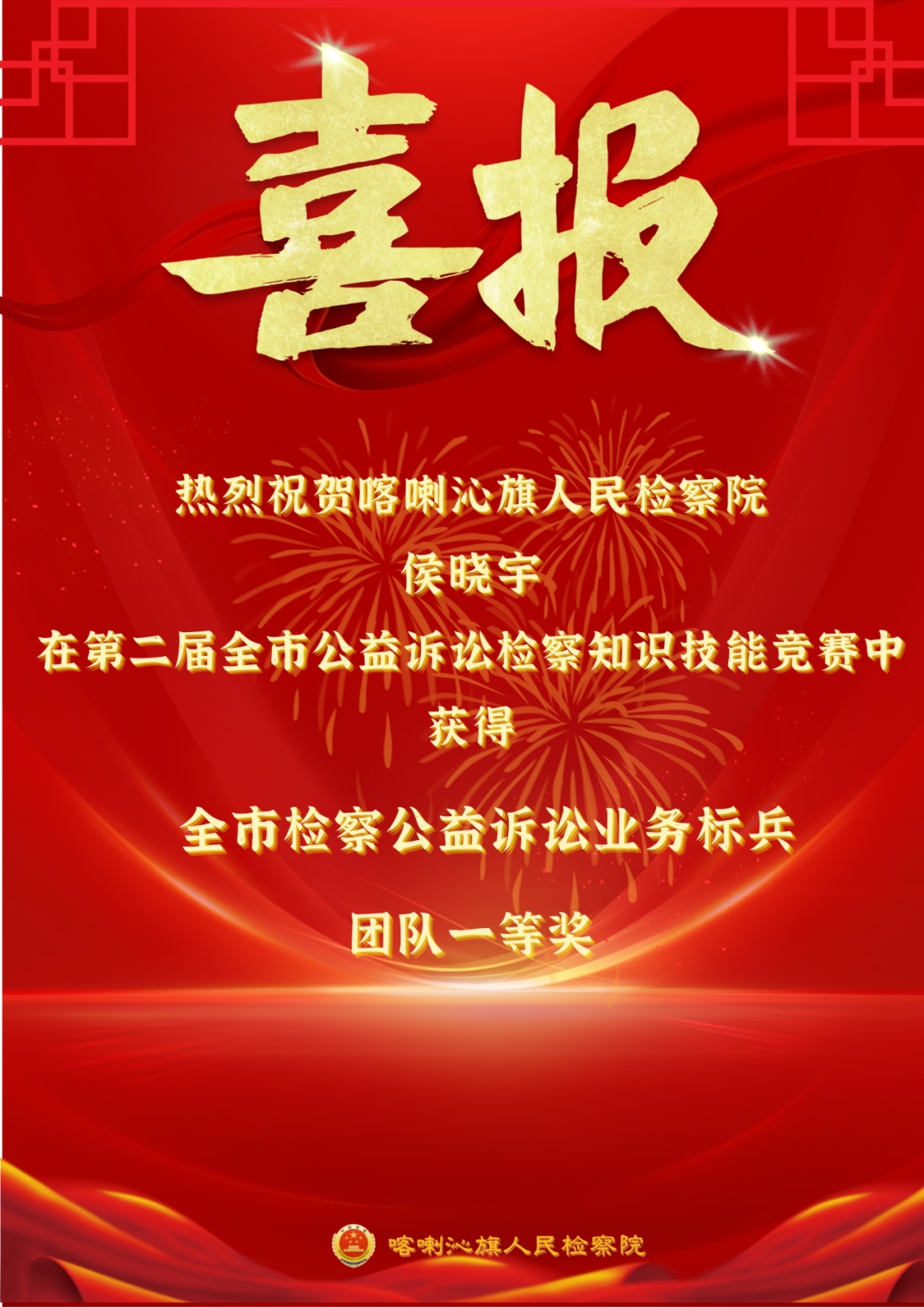 7月30日,赤峰市检察院举办第二届全市公益诉讼检察知识技能竞赛,喀喇沁旗人民检察院侯晓宇获得“全市检察公益诉讼业务标兵”和“团队一等奖”。